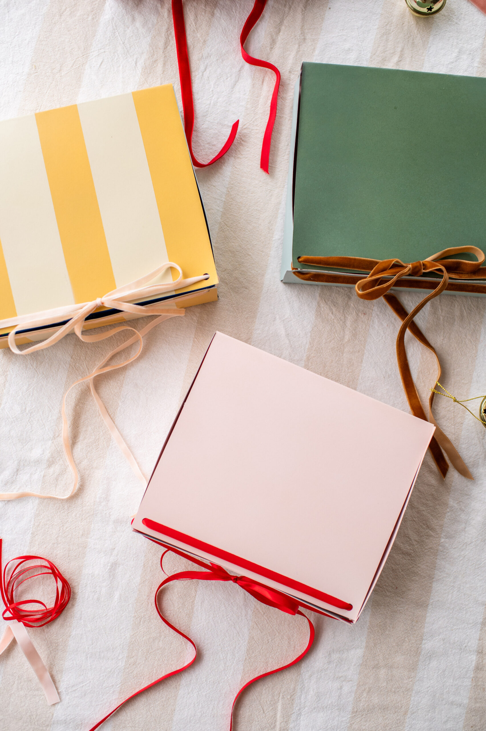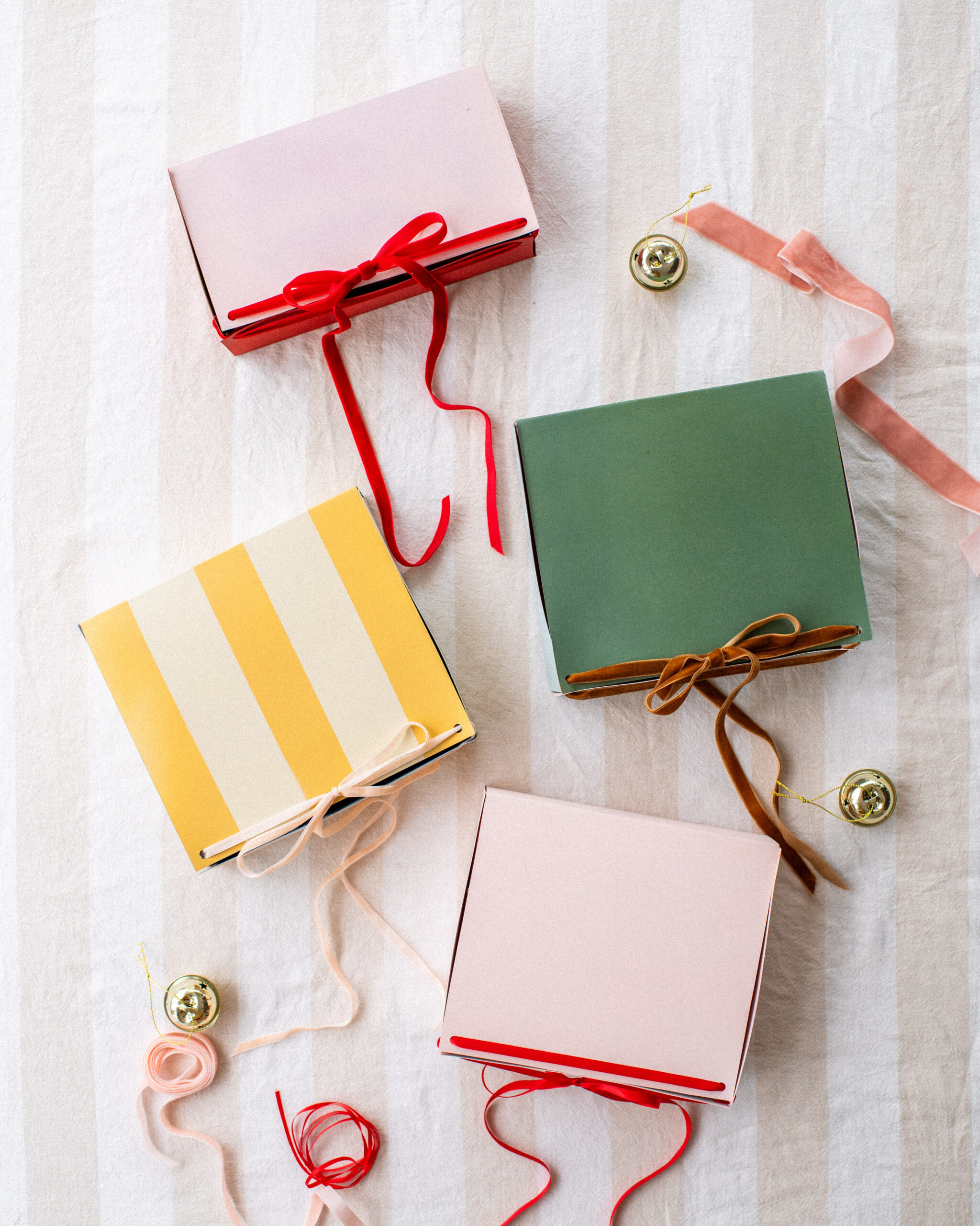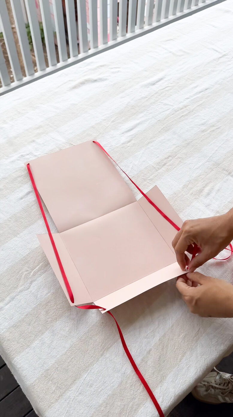 Step 5: Tie it together: Place your gift inside, then pull the ribbon ends gently to draw the sides together — the folds will close in beautifully, creating a soft, gathered finish. Tie in a bow to secure, and you’re done!